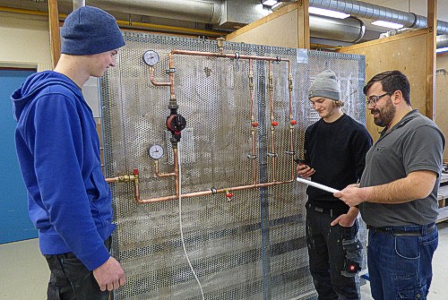 | Ausbildungsmeister Christoph Stich mit Schülern, die den hydraulischen Abgleich mit der Grundfos Go App durchführen. |
