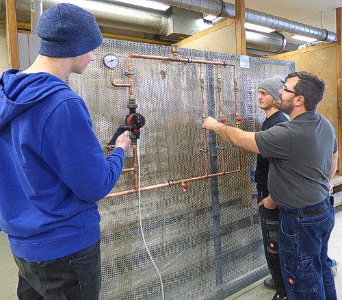 | Ausbildungsmeister Christoph Stich mit Schülern, die den hydraulischen Abgleich mit der Grundfos Go App durchführen. |